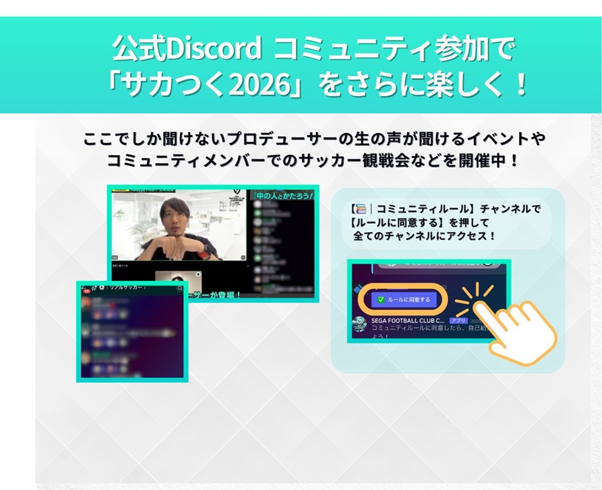 戦術トーク、理想のクラブ談義、懐かしのサカつく話まで…サポーター同士が気軽に語り合える場として、公式Discordコミュニティ。久井プロデューサーの生の声が聞けるイベントやサッカー観戦会などが定期的に開催されている。