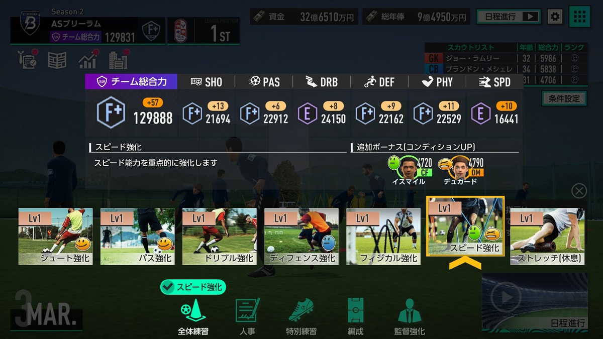 自クラブの選手たちは、シュート強化、パス強化など能力をアップさせる練習や、疲労が溜まった場合に休ませるストレッチ(休息)などを【全体練習】で設定したり、空いている特練枠に育てたい選手と練習メニューを決める特別練習カードをセットして重点的に強化したい選手の能力を効率的に伸ばす【特別練習】で成長させていこう。