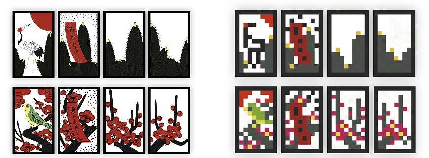 花札の絵柄はすべて8×14マスのドット絵で構成し、使用する色数も必要最小限まで絞り込んだ、極限のミニマルデザインとしている。