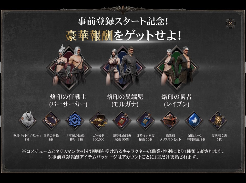 ※コスチュームおよびタリスマンセットは、受け取るキャラクターの 職業・性別 により内容が異なる。