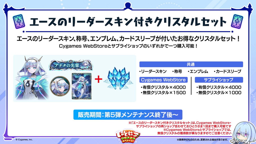 「エース」のリーダースキン、称号、エンブレム、カードスリーブとクリスタルがセットになった「エースのリーダースキン付きクリスタルセット」を始めとするお得なセットを販売する。