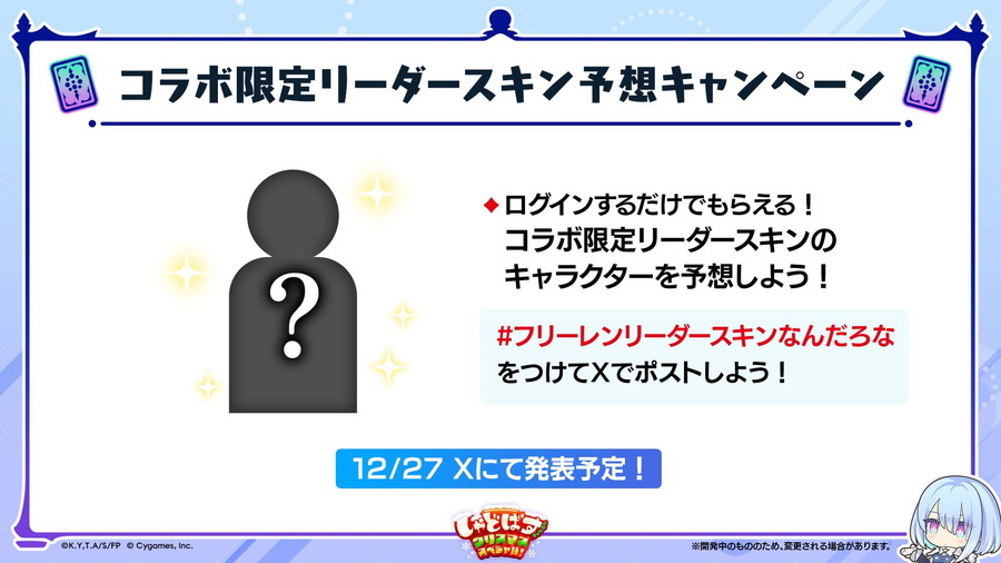 「○○もらえる!年末年始はシャドバキャンペーン!」では、期間中8日間ログインするだけで"あの"コラボキャラクターのリーダースキンや、カードスリーブ、エンブレム、そして合計30枚のカードパックが獲得できる。また、どのキャラクターのリーダースキンが登場するか予想する SNS キャンペーンを開催する。