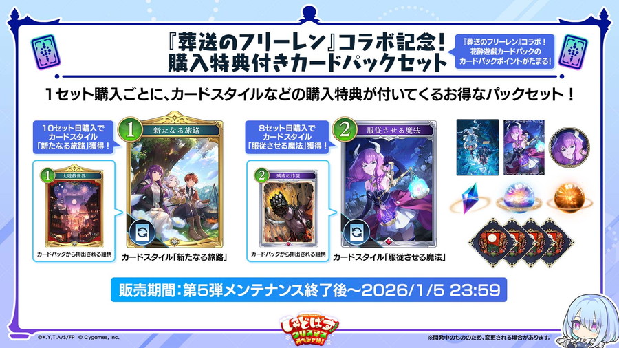 第5弾 メンテナンス終了後から「『葬送のフリーレン』コラボ記念!購入特典付きカードパックセット」が販売される。1セット購入ごとにカードスタイルなどゲーム内で使用できる特典が必ず入手できる。