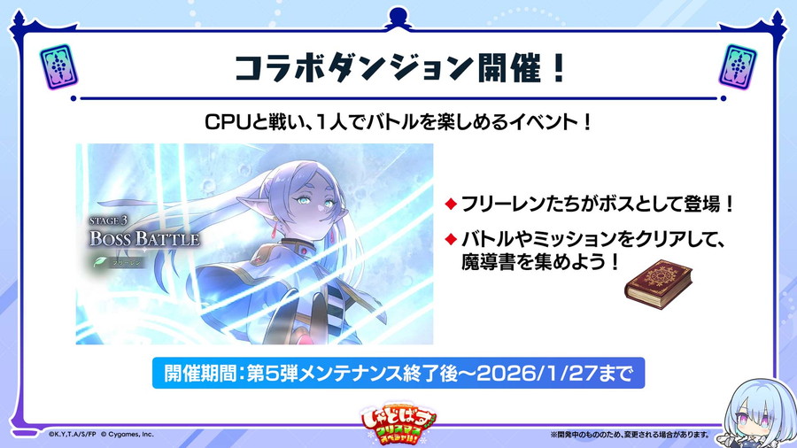 12月29日のメンテンナンス終了後からアニメ『葬送のフリーレン』とのコラボを開催することが決定した。「フリーレン」をはじめとする人気キャラクター達が『シャドウバース ワールズビヨンド』のゲーム内に登場する。