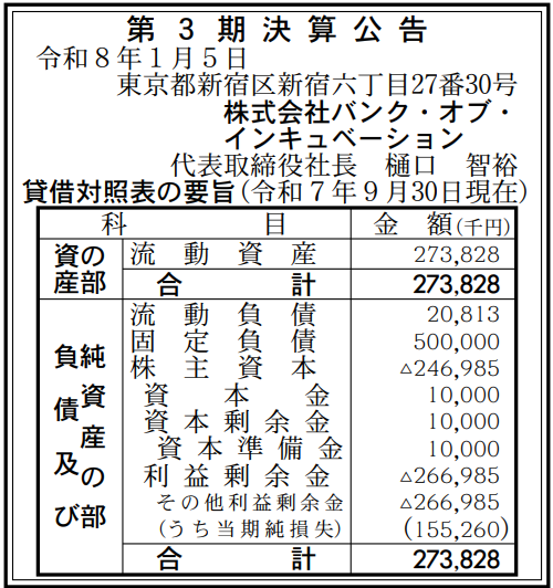 バンク・オブ・インキュベーションの2025年9月期(第3期)の決算は、最終損失が1億5500万円と赤字幅が拡大した。債務超過となっている。前の期(2024年9月期)の実績は、最終損失8100万円だった。1月5日付の『官報』に掲載された「決算公告」で判明した。