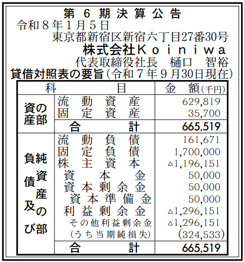 Koiniwaの2025年9月期(第6期)の決算は、最終損失が3億2400万円と赤字幅が拡大した。債務超過となっている。前の期(2024年9月期)の実績は、最終損失3億1500万円だった。1月5日付の『官報』に掲載された「決算公告」で判明した。