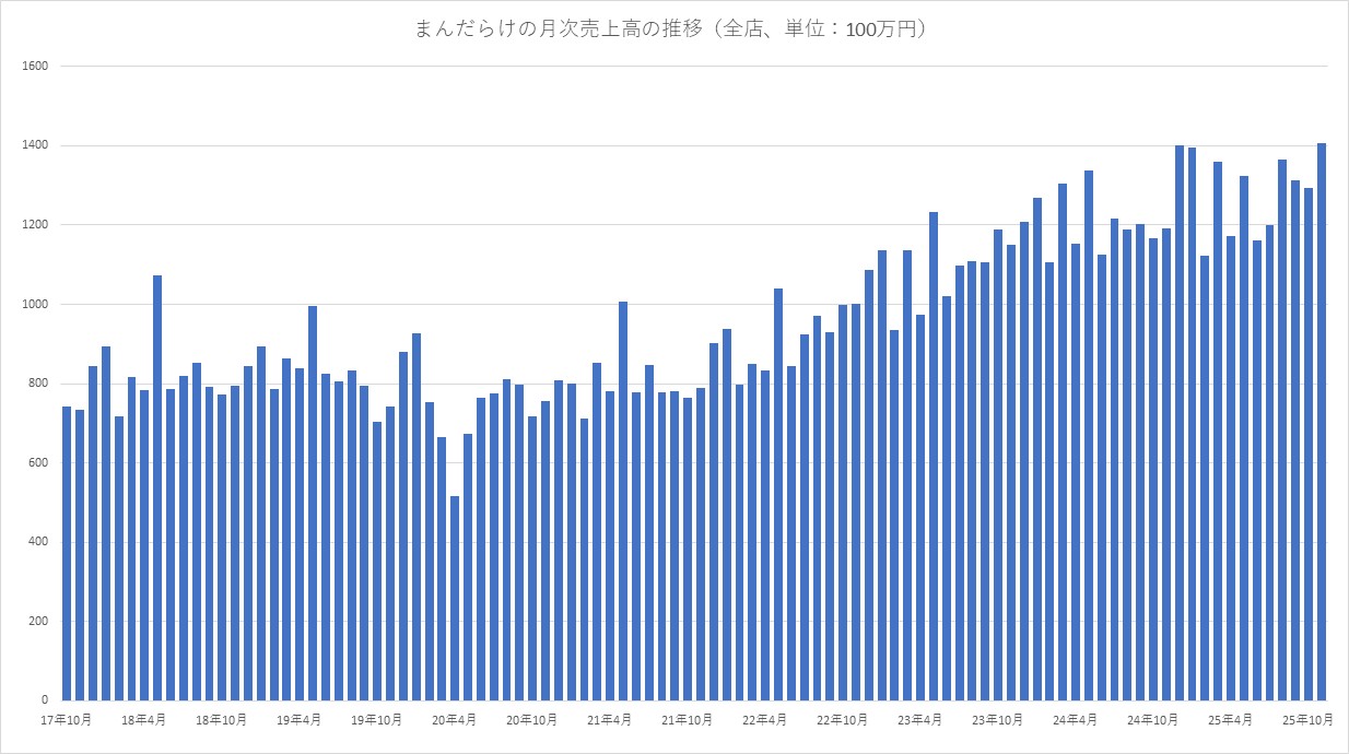 まんだらけ<2652>は、2025年11月の月次売上高について、全店が前年同月比18.1%増の14億0700万円、既存店が同18.2%増の13億8800万円だったと発表した。全体の月次売上高は過去最高となったようだ。10月からの累計では、全店が同14.4%増の27億0200万円、既存店が同13.3%増の26億5600万円だった。