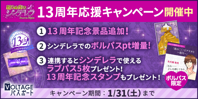 毎日の胸きゅんが貯まる!無料会員ポイントサイト「VOLTAGEパスポート」(以下、「ボルパス」)にて「シンデレラSN」13周年応援キャンペーンを開催している。