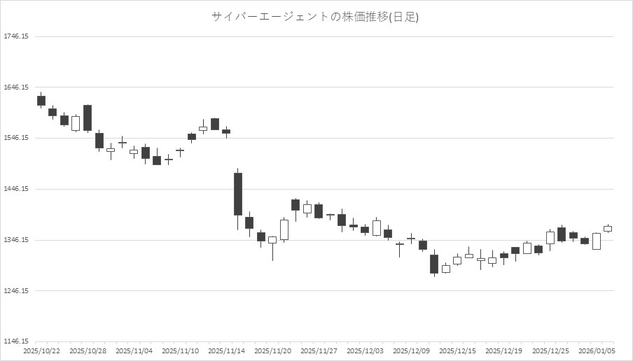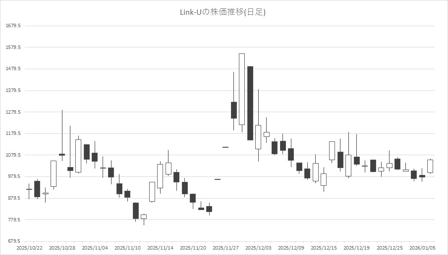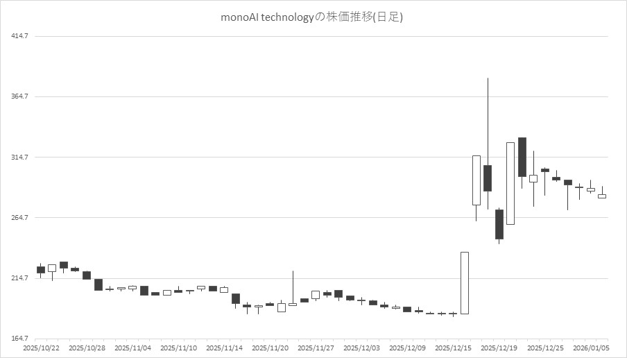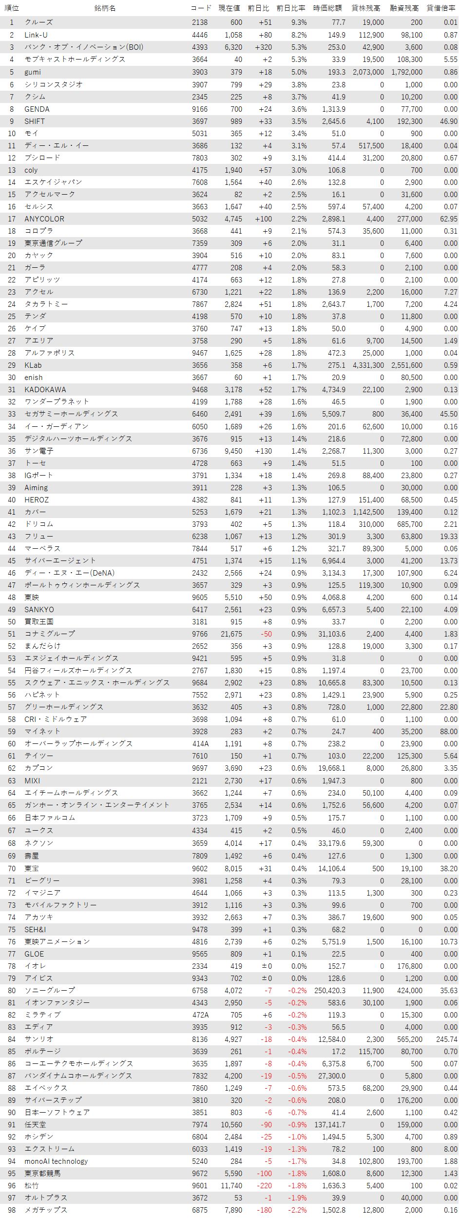 最後に騰落ランキングを見ると、クルーズ<2138>やLink-U<4446>、バンク・オブ・イノベーション(BOI)<4393>、モブキャストHD<3664>、gumi<3903>が値上がり率上位となり、メガチップス<6875>、オルトプラス<3672>、松竹<9601>、東京都競馬<9672>、monoAI technology<5240>が値下がり率上位となった。