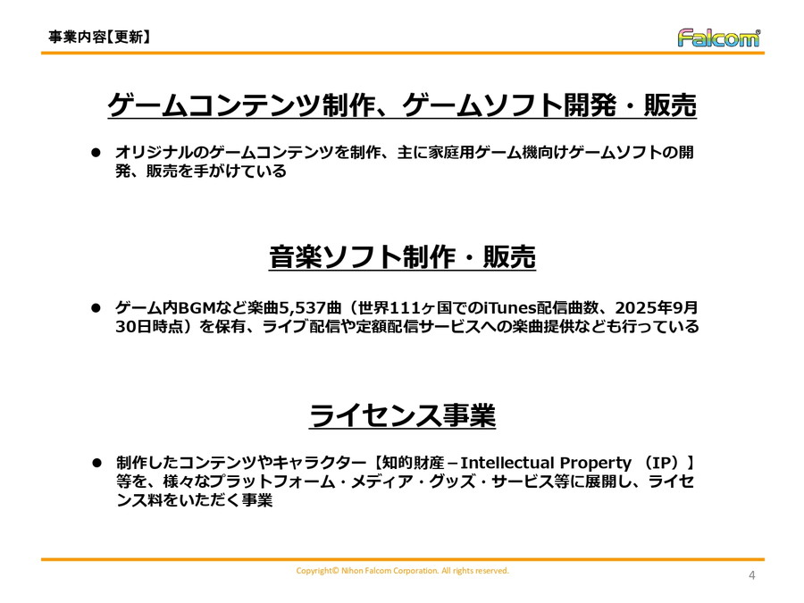 主力のゲーム事業では、家庭用ゲーム機向けを中心にオリジナルタイトルを自社開発。音楽事業では、ゲームBGMを中心に5537曲(9月末時点)の楽曲資産を保有し、ライブ配信や定額音楽配信サービスへの提供も行っている。