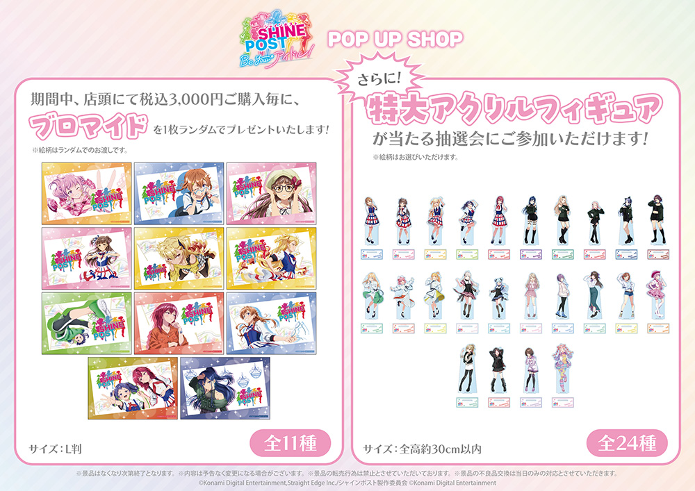 今回のイベントでは、『シャインポスト Be Your アイドル!』(KONAMI)に登場するイラストを使った缶バッジをはじめ 「シャインポスト」の新作グッズを販売する。