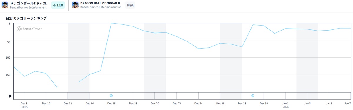 バンダイナムコエンターテインメントの『ドラゴンボールZ ドッカンバトル』は6ランクアップで16位に浮上した。