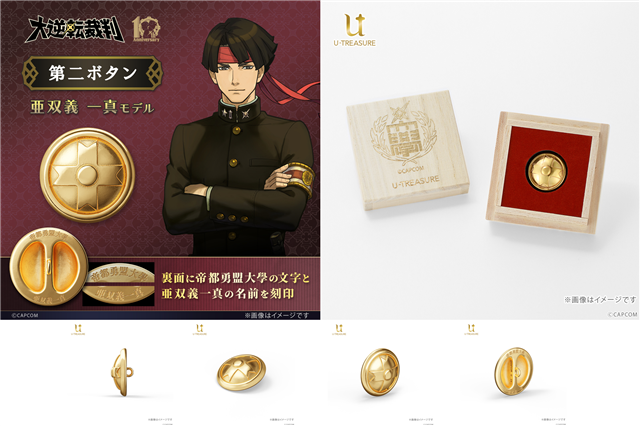 『大逆転裁判』のシリーズ10周年を記念して製作された「第二ボタン」は、塗和也監修のもと、帝都勇盟大學の学生服のボタンをジュエリー職人が丁寧に再現し、ボタン裏に帝都勇盟大學の文字と、成歩堂、亜双義のそれぞれの名前を刻印。特製の桐箱ケースに入れてお届けする。特別な記念の品として、永く楽しめる。お届けは2026年6月下旬ごろを予定している。