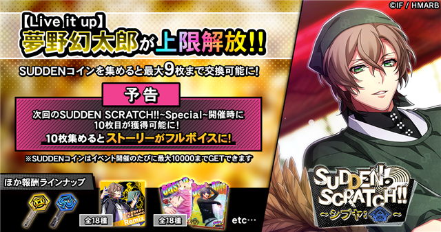 イベント期間中、KILLER SCRATCH!!をプレイするとライズ消費量に応じた確率でSUDDEN SCRATCH!!が発生する。SUDDEN SCRATCH!!をプレイすると、通常の報酬アイテムの他、限定アイテム「SUDDENコイン」を獲得することができる。「SUDDENコイン」を集めることで、「A.R.B remix」楽曲やレイズキー、シブヤ・ディビジョンのデコステッカーに使えるブースターなどと交換することが可能。また、ストーリーカード「SSR【Live it up】夢野幻太郎」が上限解放され、最大9枚まで獲得できる。さらに、SUDDEN SCRATCH!!~Special~の開催時には10枚目が獲得可能となり、10枚集めるとカードストーリーがフルボイスに!詳細はアプリ内お知らせで確認できる。