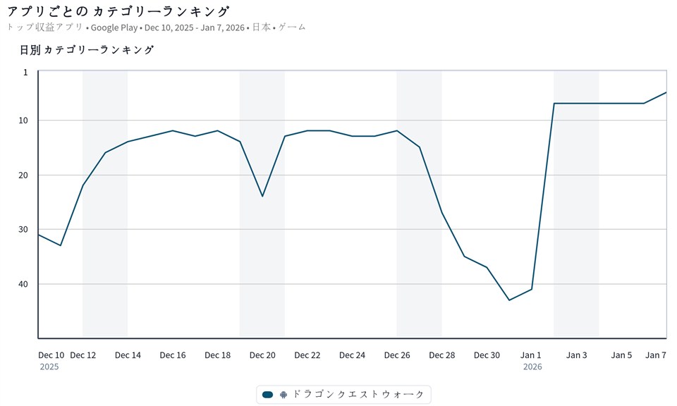 また、スクウェア・エニックスの『ドラゴンクエストウォーク』が5位に順位を上げてきた。『DQウォーク』は、1月1日から新スキル「ギガスラッシュ・レジェンド」を習得できる★5ぶき「ロトの竜剣」が登場した「新春2026 ロトの竜剣ふくびき」を実施していることなどが足元の順位上昇に寄与しているようだ。