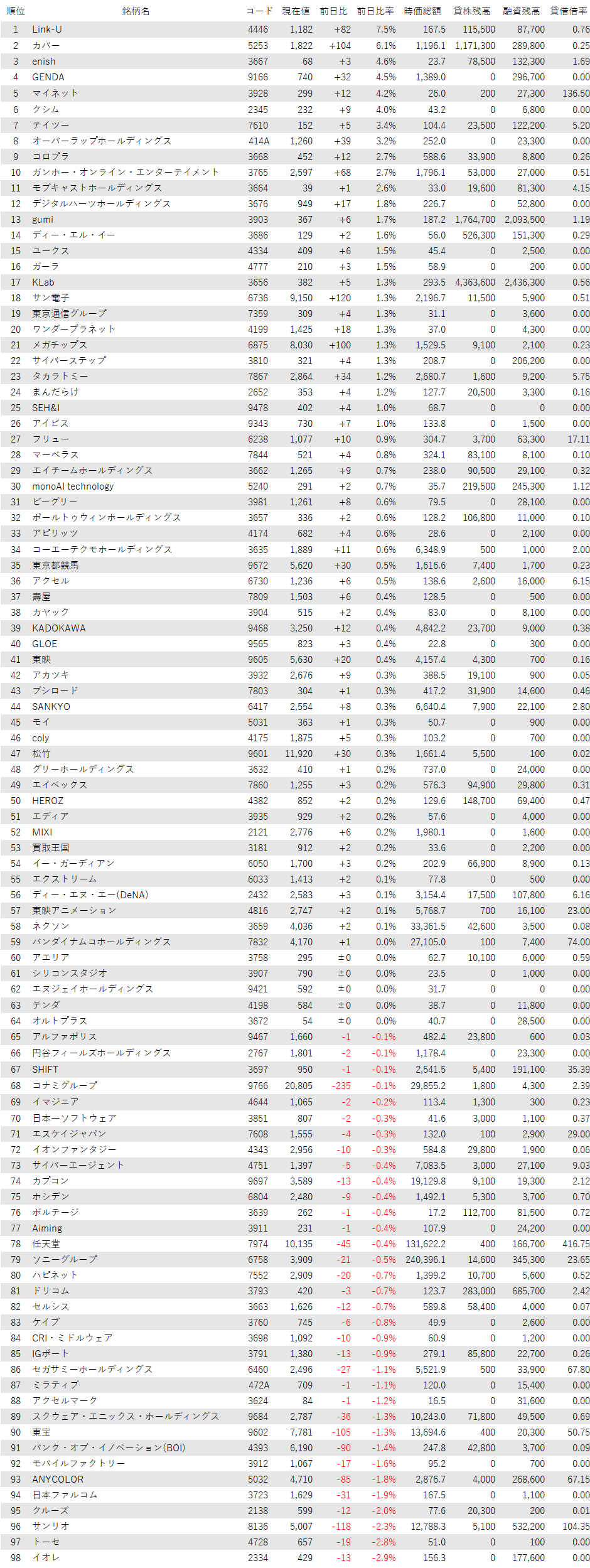 こうしたなか、ゲーム・エンタメ関連企業をみると、登録されている98銘柄のうち、上昇は59銘柄(60%)、下落は34銘柄(35%)、変わらずは5銘柄(5%)で、買い優勢だった。