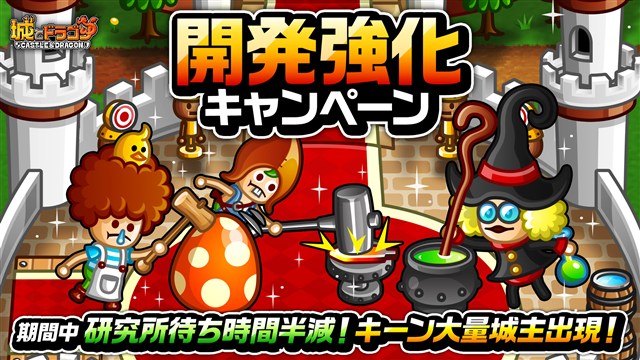 武具・スキルの研究開発やタマゴのふ化など「研究所」に関わる全ての所要時間が通常の半分になる「研究所待ち時間半減キャンペーン」を開催中。さらに、敵城を攻め落とす「攻撃」の全モード(ひとりで/みんなで)を対象に、大量の“キーン”を持った城主が出現することがある「キーン大量城主出現キャンペーン」を開催中。