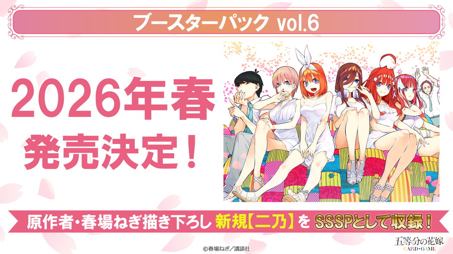 五等分の花嫁 カードゲームは2026年1月より2ndシーズンに突入する。2ndシーズン第1弾商品となる、ブースターパック vol.5進み続ける日常は1月16日発売となる。原作者・春場ねぎ先生描き下ろしの新規イラストの一花がSSSPで登場。