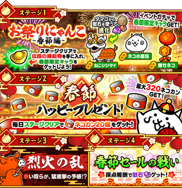 期間中、4種類の限定ステージを開催する。「お祭りにゃんこ~春節編~」は、クリアするとイベントガチャを回せる「伝説の縁起物」が手に入るチャンス!他にも毎日クリアでネコカンが入手できる「春節ハッピープレゼント!」や、赤い敵たちが続々と襲撃する「烈火の乱」も登場!イベント2週目からは獣石が手に入るステージ「春節セールの戦い」が登場予定!