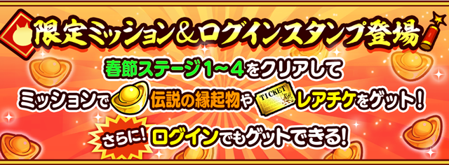 「お祭りにゃんこ~中国春節編~」イベントを対象としたスペシャルミッションが登場する。また、期間限定のログインスタンプキャンペーンも実施!ミッションクリアや毎日ログインで「伝説の縁起物」や「レアチケット」をゲットしよう。