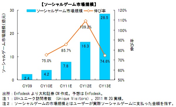 大和証券CMによれば、中国のインターネット業界では、ここ数年、PC向けオンラインゲームが市場拡大のけん引役であったものの、今後は3G回線の整備やスマートフォンの普及を背景に、モバイルゲームの爆発的な伸びが期待されているという。通信環境の問題や課金代行手数料が売り上げの4~6割と高いため、すぐに高い成長にはならないが、大都市部を中心に拡大を見込まれており、有力ネット企業各社はコンテンツリリースの準備を進めている。