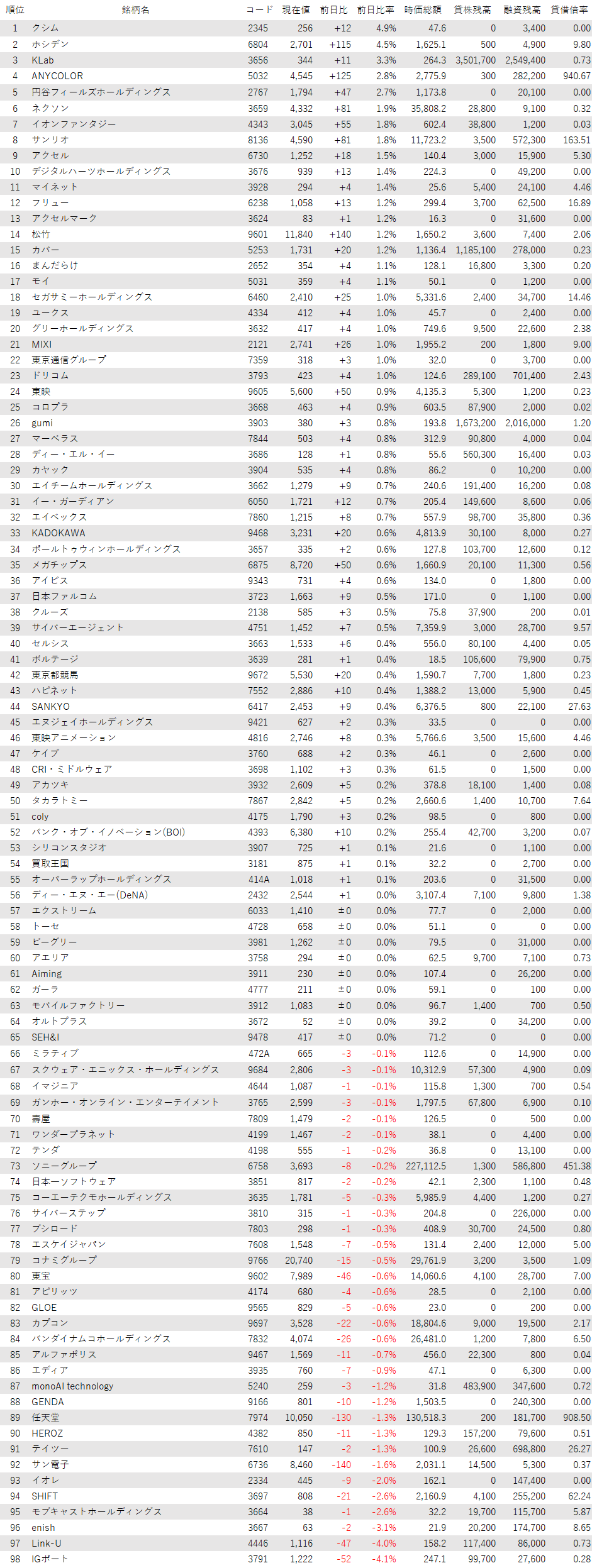 最後に騰落ランキングを見ると、クシム<2345>やホシデン<6804>、KLab<3656>、ANYCOLOR<5032>、円谷フィールズHD<2767>が値上がり率上位となり、IGポート<3791>、Link-U<4446>、enish<3667>、モブキャストHD<3664>、SHIFT<3697>が値下がり率上位となった。