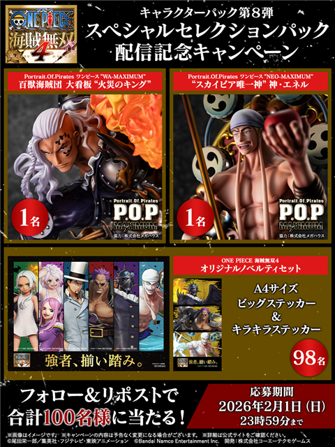 DLC第8弾「スペシャルセレクションパック」の配信を記念して、「Portrait.Of.Pirates」シリーズのフィギュアなど豪華賞品が抽選で合計100名に当たるキャンペーンを開始した。