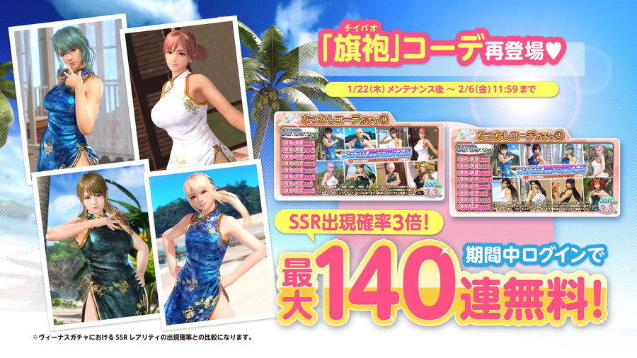 「魅惑の実験キャンペーン」では、最大14日間、過去に登場したSSR水着「旗袍・青龍」「旗袍・白虎」「旗袍・玄武」が再登場する「なつかしコーデガチャ」専用の10連ガチャチケットが毎日もらえるログインボーナスを開催している。これにより、最大140連無料でガチャを楽しむことができ、SSRの出現確率はヴィーナスガチャの約3倍となる3.3%である。