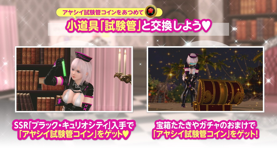 新イベント「ドキドキ・実験タイム」を開始した。イベントをプレイし、「アヤシイ試験管コイン」を集めることで、『小道具「試験管」 観察する』を手に入れることができる。これは新SSR水着「ブラック・キュリオシティ」とあわせての撮影を楽しむための小道具である。
