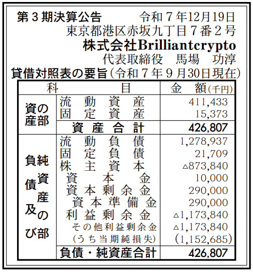 コロプラ<3668>子会社のBrilliantcrypto(ブリリアントクリプト)の2025年9月期(第3期)の決算は、最終損失11億5200万円だった。前の期(2024年9月期)の実績は、最終損失19億1100万円を計上しており、赤字幅こそ縮小したものの、3期連続での巨額の赤字計上となった。債務超過となっている。本日1月23日付の「官報」に掲載された「決算公告」で判明した。