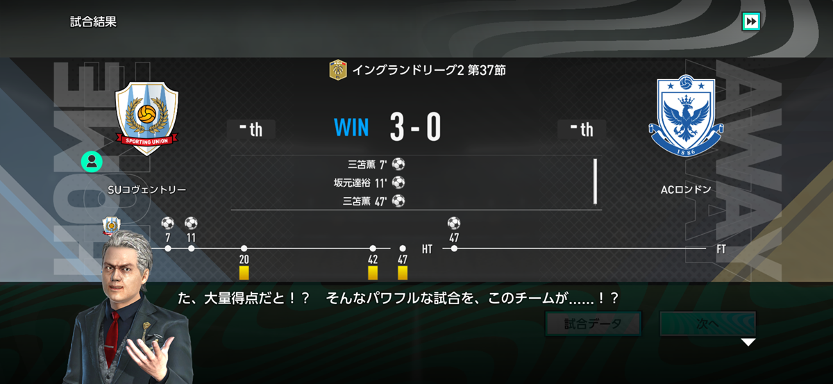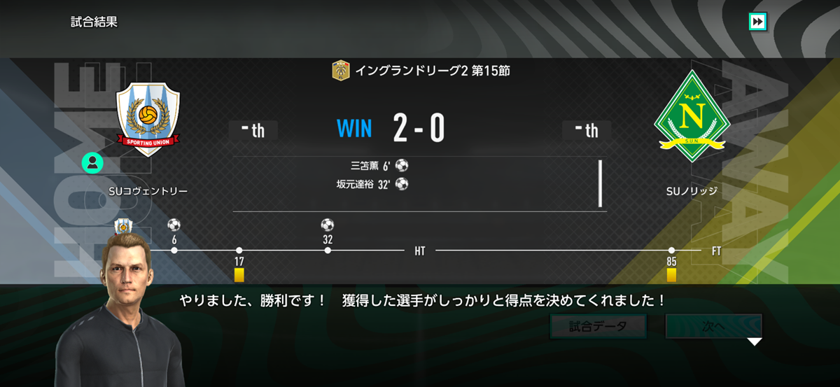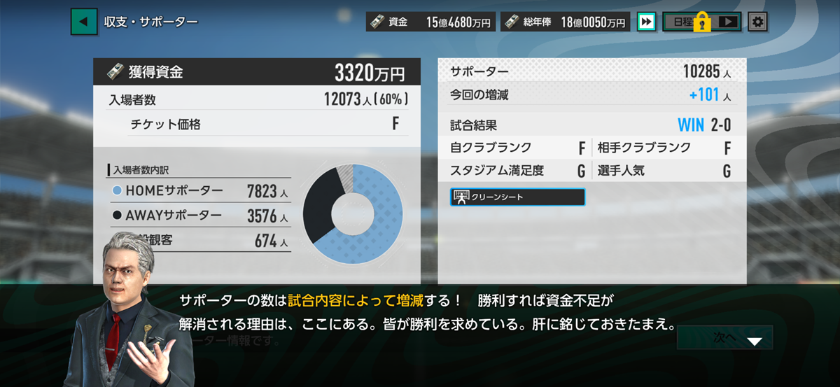 初陣は2-0で勝利。ホームゲームでは入場者数に応じて資金が獲得できるってことで、サポーターをどんどん増やせばいいんだな。余裕っしょ。