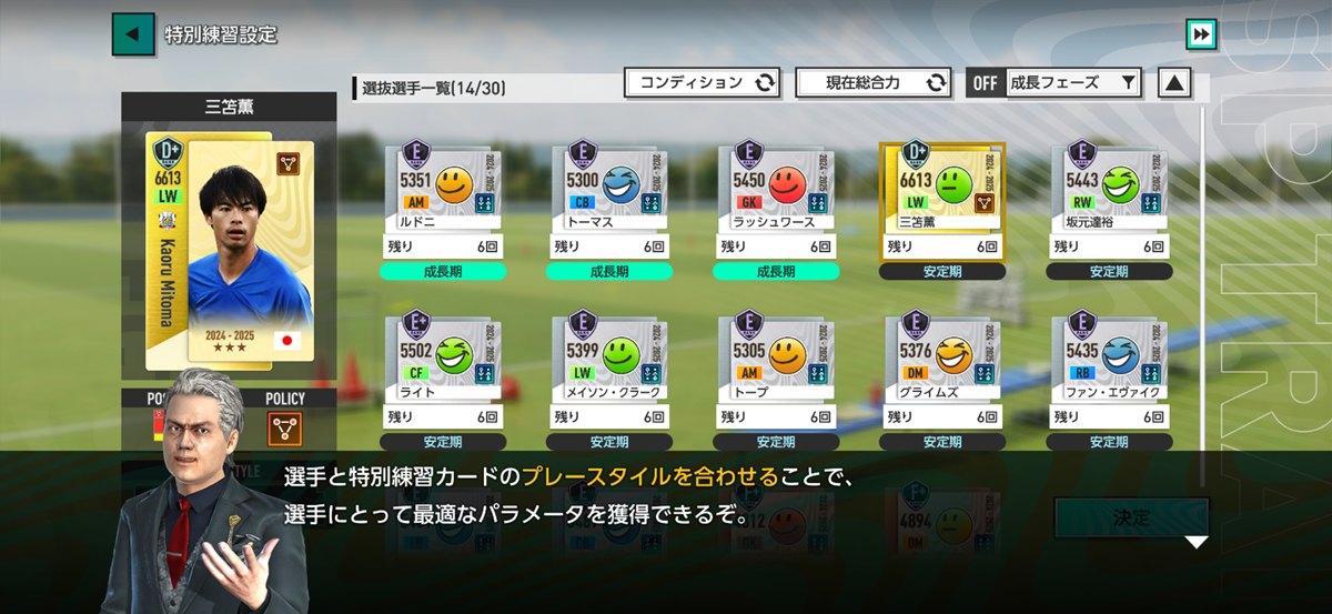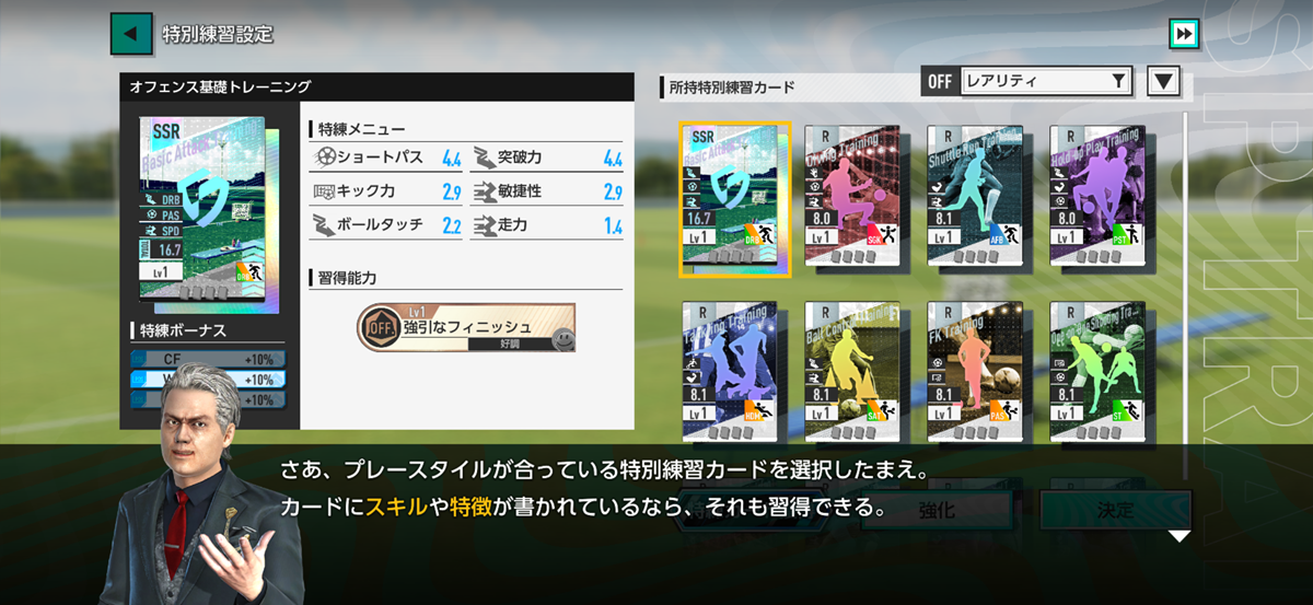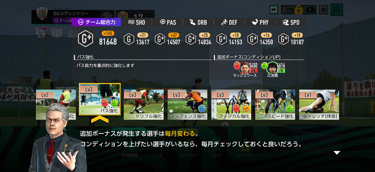 そんなわけで、選手たちを劇的にステップアップさせる“特別練習”や“特別練習カード”の強化、各種能力アップやコンディション管理ができる“全体練習”についても教わったよ。
