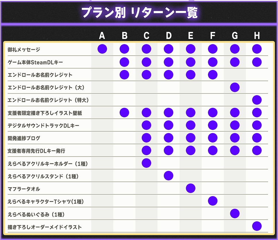 支援者には、ゲーム本編のダウンロードキーに加え、クラウドファンディング限定の特別なグッズや体験を用意する。