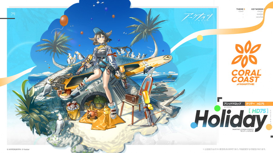 アシッドドロップ専用、CoralCoastシリーズ「ホリデーHD75」。通気性と肌触りがよく、砂浜でリラックスするには最適の一着。「ボクの百発百中のパフォーマンス、楽しみにしててよ!」