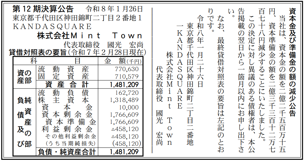 Mint Townが減資を行うことがわかった。本日1月26日付の「官報」に掲載された「資本金及び準備金の額の減少公告」によると、資本金を2億2500万円、資本準備金を2億3300万円減らすとのこと。1年前のこの時期にも減資を行っていた(関連記事)。