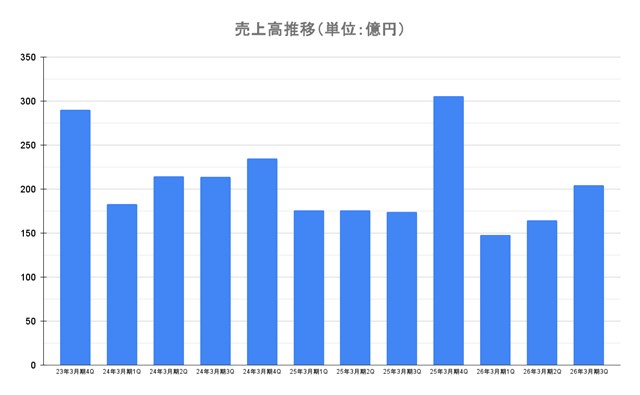 コーエーテクモホールディングス<3635>は、1月26日、2026年3月期の第3四半期累計(4~12月)の連結決算を発表、パッケージゲーム4タイトルを発売し、オンライン・モバイルゲームでは同社が開発した2タイトルが運営を開始したことで、第2四半期までの実績より減収減益幅を縮小し、小幅な減収・営業減益となった。