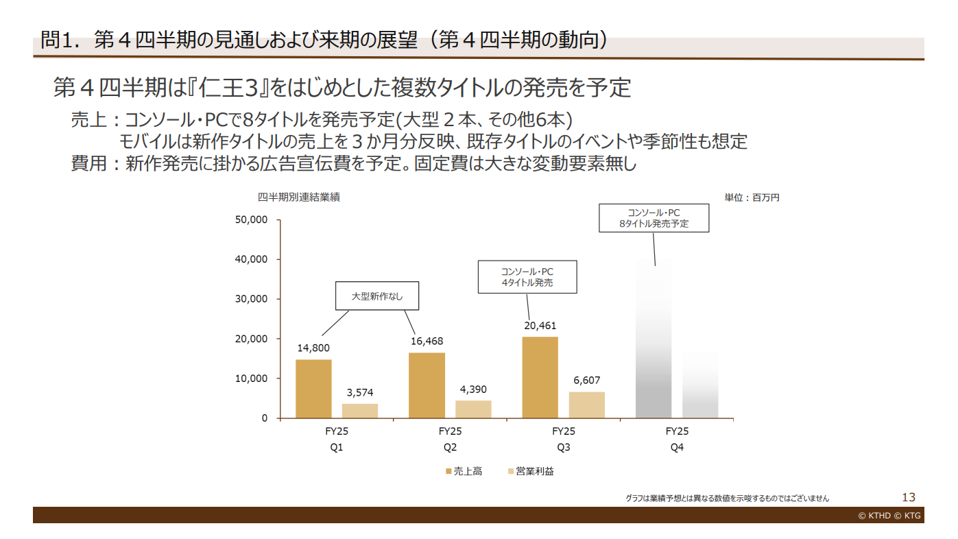 続く第4四半期(26年1~3月)においては、『仁王3』(2月6日)、『ぽこ あ ポケモン』(3月5日)、『三國志8 REMAKE with パワーアップキット』(1月29日)、『Winning Post 10 2026』(3月)、『零 ~紅い蝶~ REMAKE』(3月12日)など8タイトルを投入する計画だ。