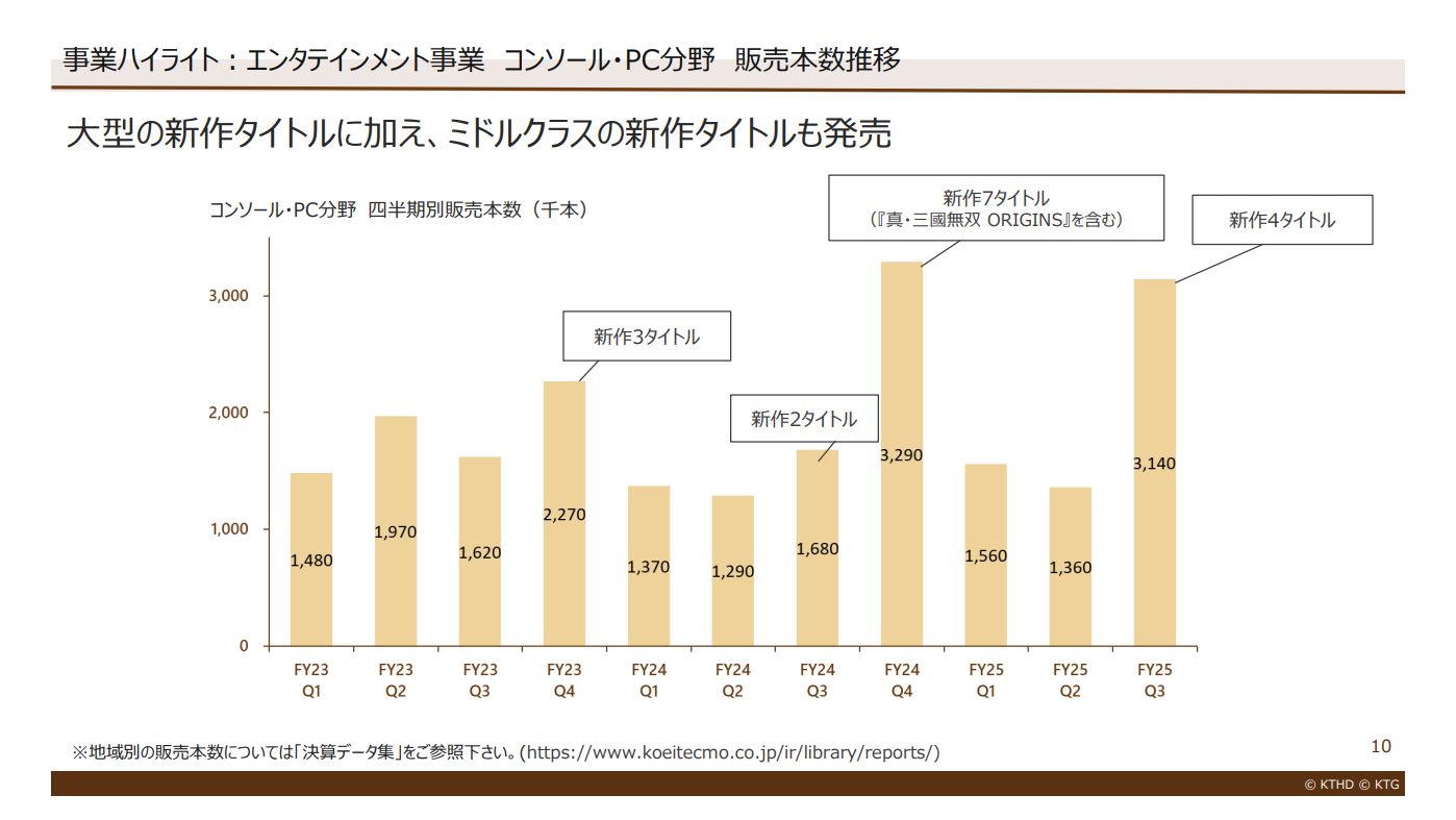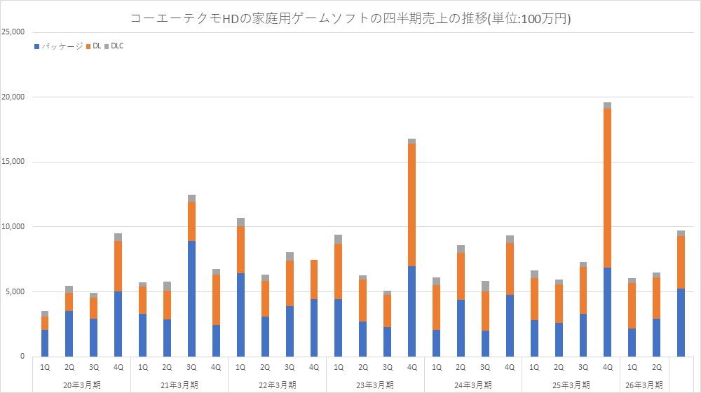 コーエーテクモホールディングス<3635>は、この日(1月26日)、第3四半期(25年10~12月)の決算を発表し、コンソール・PCの売上高が前年同期比32.8%増の96億9900万円と大幅に伸びたことを明らかにした。内訳は、ダウンロードコンテンツが同5.1%のマイナスとなったものの、パッケージ等が同58.9%増の52億6400万円、ダウンロード販売が同13.0%増の40億4700万円と伸びた。