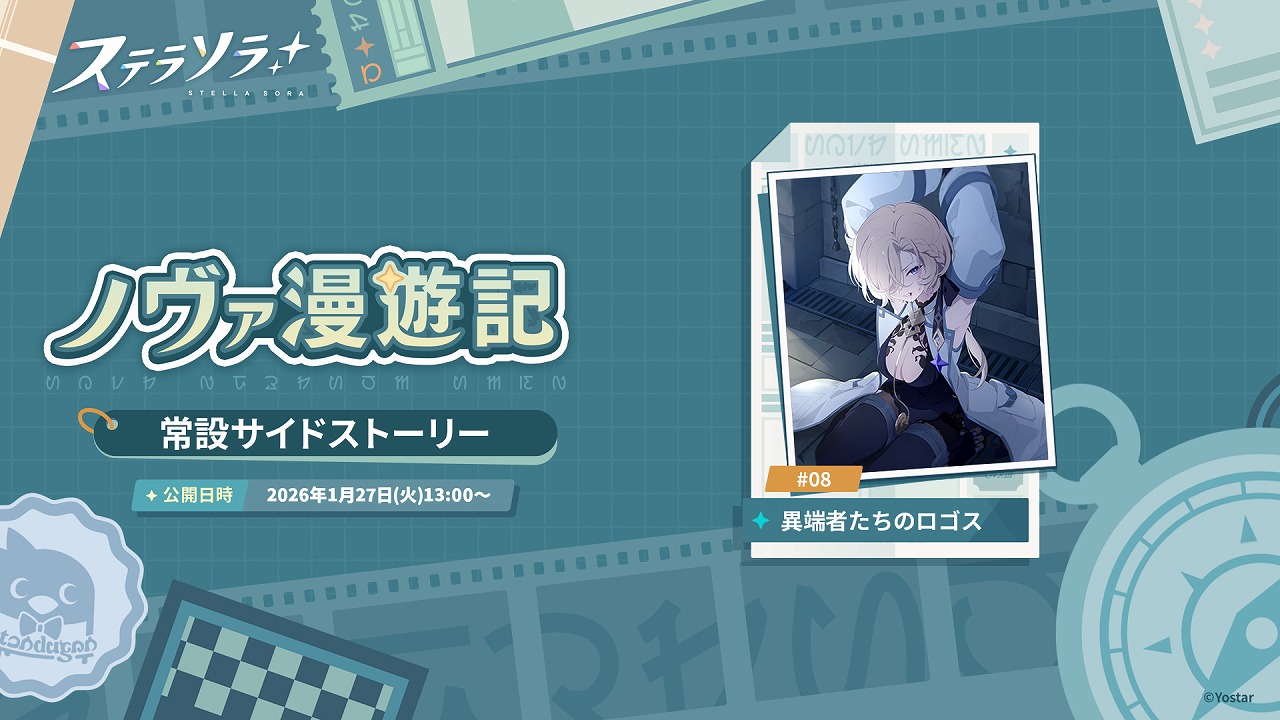 Yostarは、『ステラソラ』において、1月27日13:00より★5巡遊者「ミスティ」らが対象となるピックアップガチャや、イベント【記録大募集】【守れ!星ノ塔】などを開催する。