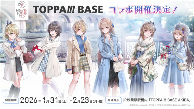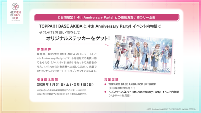 さらに、「ヘブンバーンズレッド 4th Anniversary Party! in ベルサール秋葉原」との連動企画として、1月31日〜2月1日の2日間、「TOPPA!!! BASE AKIBA」とベルサール秋葉原の2会場でそれぞれ1点以上お買い上げの方にオリジナルステッカーをプレゼント!