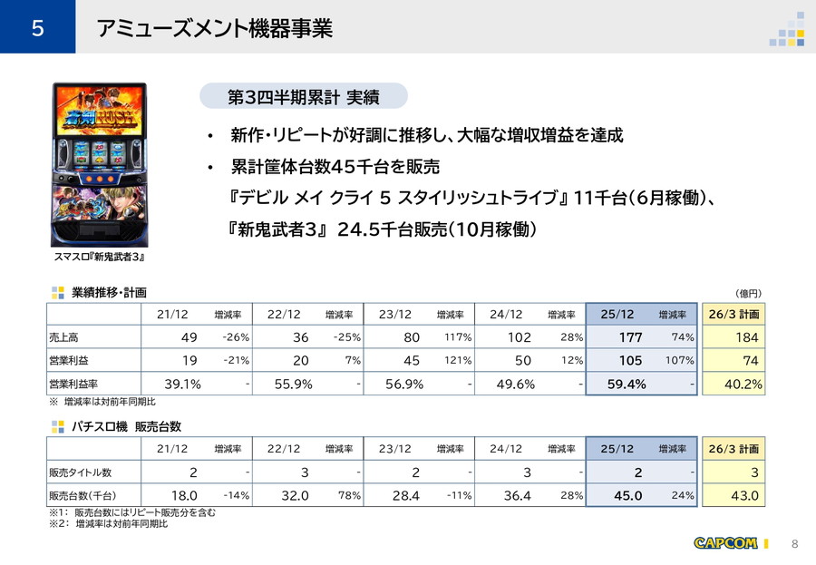 『デビル メイ クライ 5』やスマスロ『新鬼武者3』などが好調で、販売台数は4万5000台に達した。利益成長への寄与が大きいセグメントとなっている。