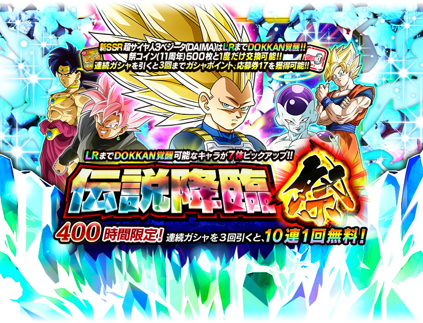 本キャンペーンでは、「DOKKANフェス」と「伝説降臨祭」を開催し、新SSRキャラクターとして「超サイヤ人4孫悟空(DAIMA)」と「超サイヤ人3ベジータ(DAIMA)」が登場する。この2体はLRまでDOKKAN覚醒後、条件を満たすと必殺技・超必殺技が新要素「EX必殺技」に変化し、ド迫力の演出とアクティブスキルで敵に大ダメージを与える。「DOKKANフェス」と「伝説降臨祭」は400時間限定で連続ガシャを3回引くごとに1回無料となる。