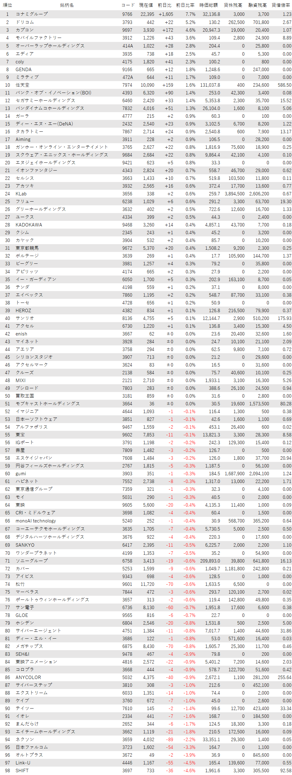 最後に騰落ランキングを見ると、コナミG<9766>、業績改善が進むドリコム<3793>、カプコン<9697>、モバイルファクトリー<3912>、オーバーラップHD<414A>が値上がり率上位となり、SHIFT<3697>、Link-U<4446>、オルトプラス<3672>、日本ファルコム<3723>、ネクソン<3659>が値下がり率上位となった。