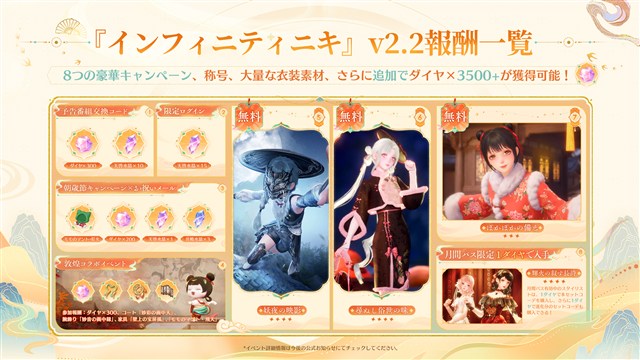 Ver2.2の各種イベント参加で、無料セットコーデ×3や天啓水晶、「敦煌」無形文化財コラボ報酬、共鳴水晶、称号、大量の衣装素材、さらにはダイヤ×3500個など、たくさんの特典が入手可能!ぜひゲーム内で確認できる。