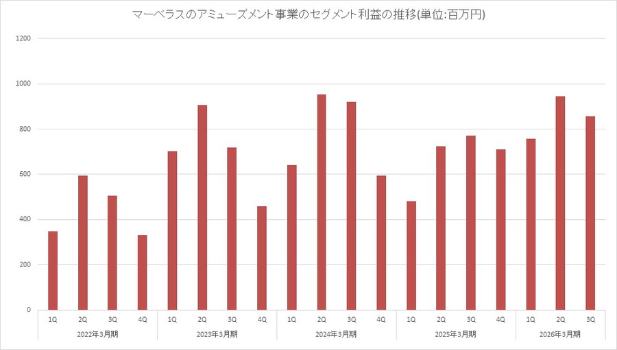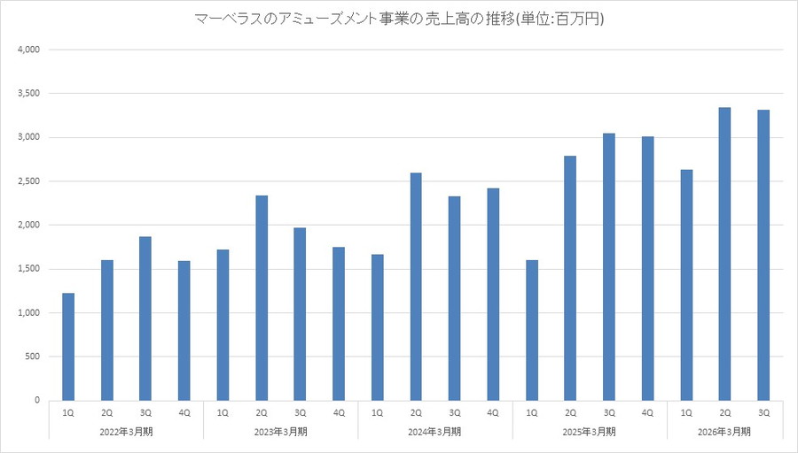 マーベラス<7844>の25年10月~12月のアミューズメント事業の業績は、売上高が前年同期比8.8%増の33億1600万円、営業利益が同11.0%増の8億5600万円だった。これで4四半期連続で前年同期比で増収増益を達成した。ポケモンキッズアミューズメントマシンの運営成績が国内外で好調に推移したため、としている。