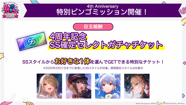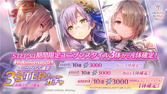 「4th Anniversary記念 ユニゾンSS確定3STEPガチャ」は有償クォーツ限定で引くことができる。出現対象のSSスタイルは、定常SSスタイルに加え、以下の期間限定ユニゾンスタイル3体も出現対象となる。