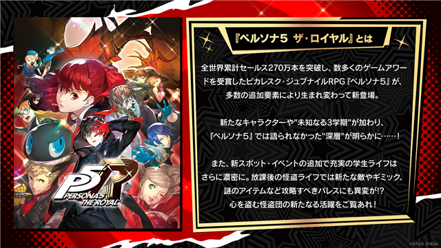 2026年で30周年を迎えた『ペルソナ』シリーズ。全世界累計セールス270万本を突破し、数多くのゲームアワードを受賞したピカレスク・ジュブナイルRPG『ペルソナ5』が、多数の追加要素により⽣まれ変わって新登場。新たなキャラクターや"未知なる3学期"が加わり、『ペルソナ5』では語られなかった"深層"が明らかに……︕また、新スポット・イベントの追加で充実の学⽣ライフはさらに濃密に。放課後の怪盗ライフでは新たな敵やギミック、謎のアイテムなど攻略すべきパレスにも異変が!?⼼を盗む怪盗団の新たなる活躍をご覧あれ!