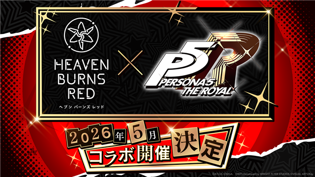 『ヘブンバーンズレッド』と『ペルソナ5 ザ・ロイヤル』のコラボが、2026年5⽉に開催決定!『ヘブバン』として初となる、本格JRPG作品同⼠のコラボ。アトラス全⾯監修のもと、書き下ろしのオリジナルストーリーイベントでの開催!続報をお楽しみに!