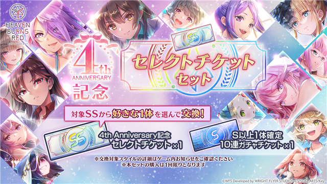 「4th Anniversary記念セレクトチケット」と「S以上1体確定10連ガチャチケット」がセットになった商品。「4th Anniversary記念セレクトチケット」では、対象SSから好きな1体を選んで交換することができる。「S以上1体確定10連ガチャチケット」は、「プレミアム10連チケットガチャ」を引くことができる。