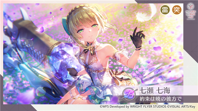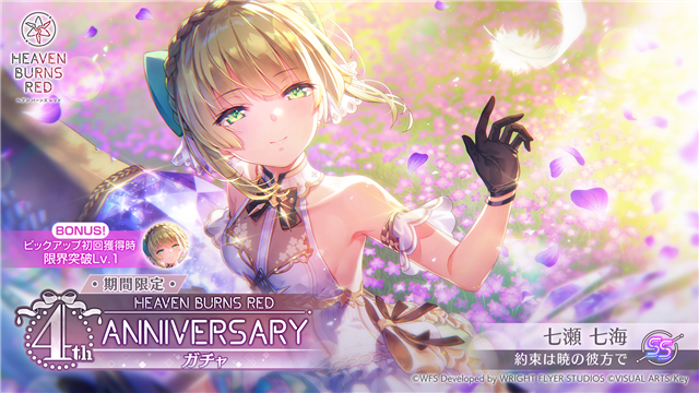 「4th Anniversary SS確定ガチャ」は有償クォーツ限定で引くことができ、新スタイルの期間限定SS<レゾナンス>[約束は暁の彼⽅で] 七瀬七海がピックアップされ、提供割合がアップする。10連⽬はSSが確定で出現。